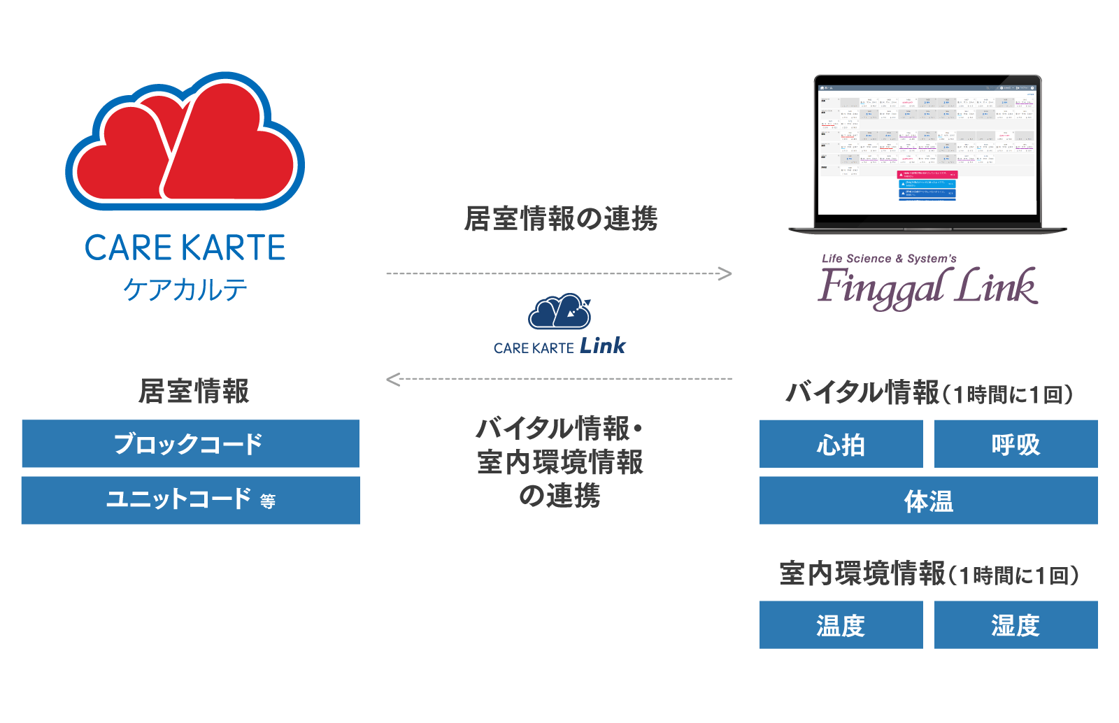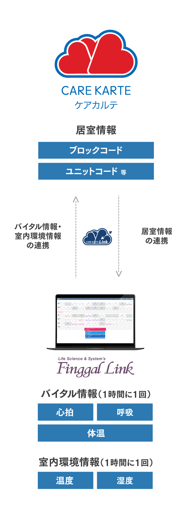 フィンガルリンクコネクトにて検知された入居者のバイタル、室内環境情報、しきい値の範囲外となったアラート記録などの情報がCAREKARTEに自動的に記録され、介護記録と併せて確認することが可能。