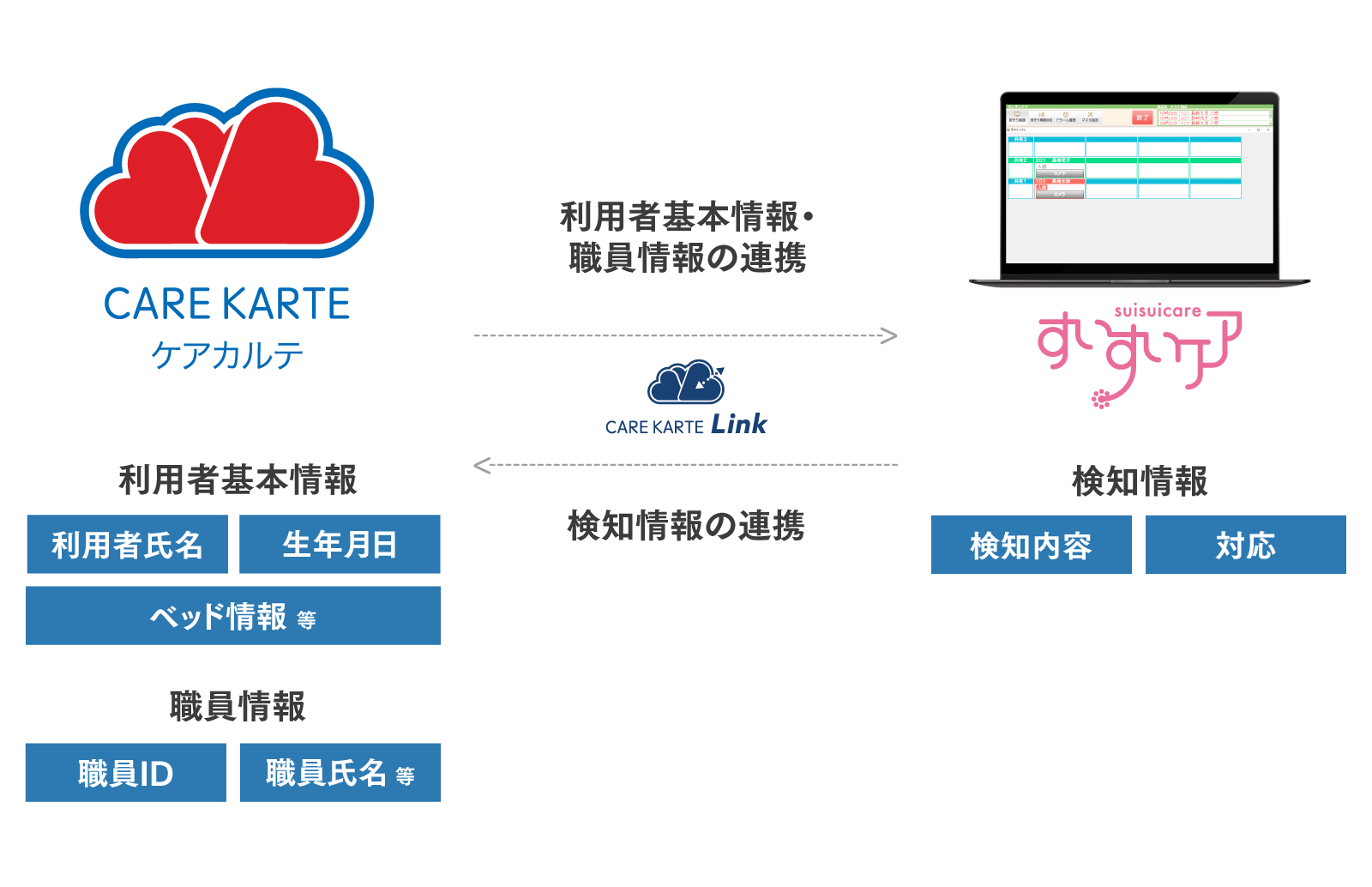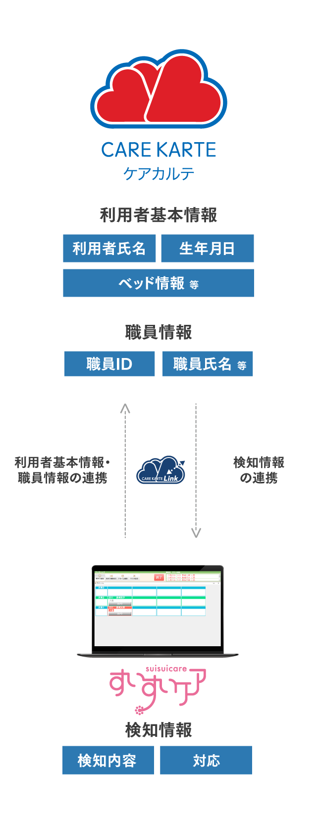 すいすいケアにて検知された情報がCAREKARTEに自動的に記録され、介護記録と併せて確認することが可能となります。