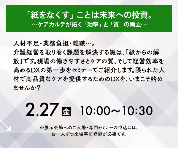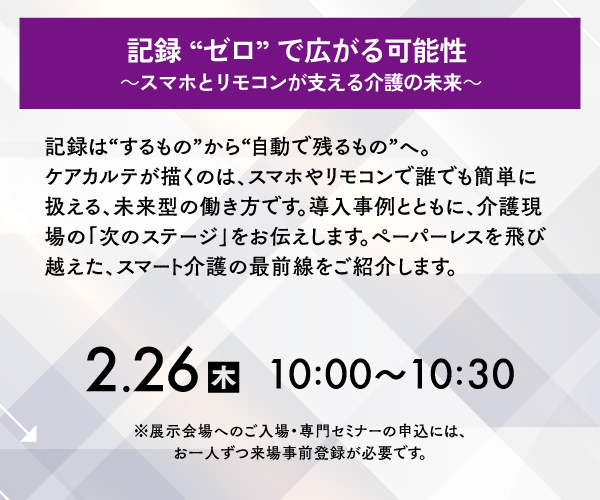 開発中の”記録を自動化”する「ケアポジ・ケアカッテ」のご紹介もしますので、皆様ぜひケアコネクトジャパンブースにお立ち寄りください。